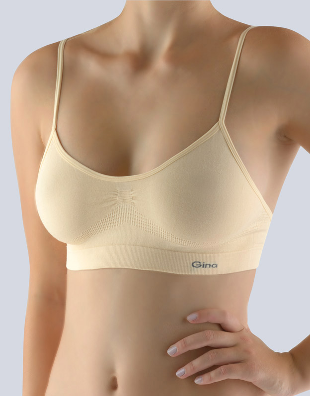 Podprsenkový top s úzkymi ramienkami, dámska bezšvová bielizeň. Dolný kraj je zosilnený a zapravený bezšvovým spôsobom. Prieramky a priekrčník sú začistené lemovacími prúžkami, ktoré prechádzajú do ramienok. Top je jednofarebný. V záložke je vypletené logo v šedej farbe.