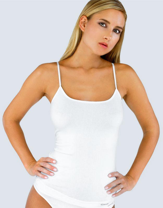 Košieľka s úzkymi ramienkami, dámska bezšvová bielizeň. Dolný kraj je zapravený bezšvovým spôsobom. Prieramky a priekrčník sú začistené lemovacími prúžkami, ktoré prechádzajú do ramienok. Košieľka je jednofarebná. V záložke je vypletené logo v šedej farbe. Košieľka je v predĺženej dĺžke.