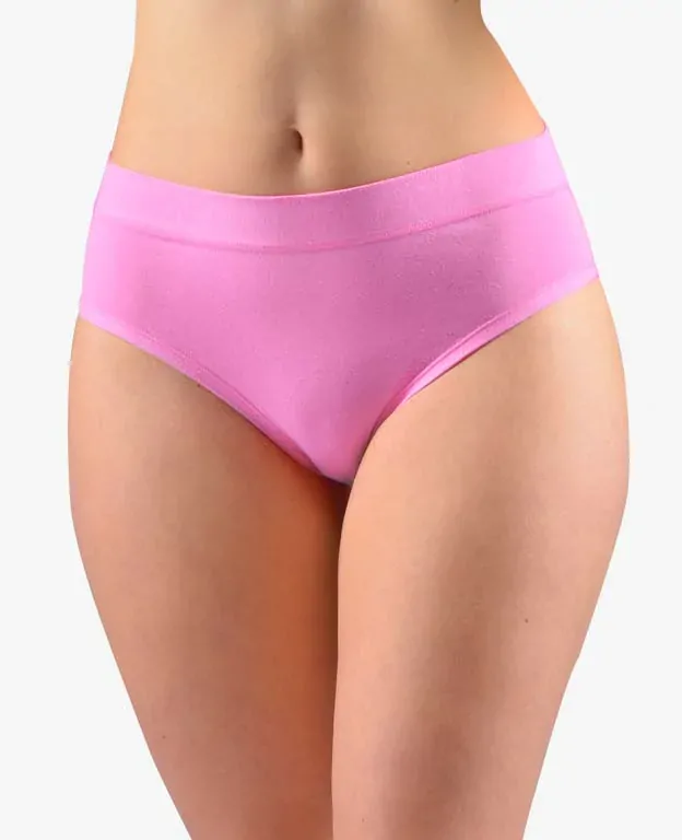 Kalhotky klasického střihu se širším pasovým lemem, dámské šité prádlo. Pasový kraj je začištěný širším lemem ze stejného materiálu. Nohavičky jsou začištěné úzkým lemem ze stejného materiálu. Kalhotky jsou jednobarevné.