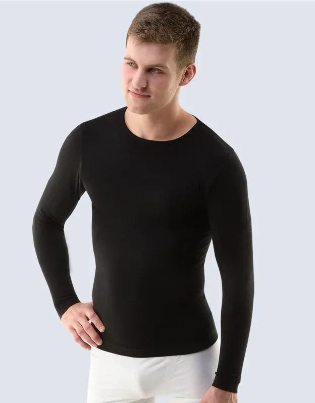 Tričko s dlhým rukávom, pánske bezšvové prádlo. Dolný kraj je zapravený bezšvovým spôsobom. Priekrčník je začistený lemovacím prúžkom. Tričko je jednofarebné. Je bez loga.