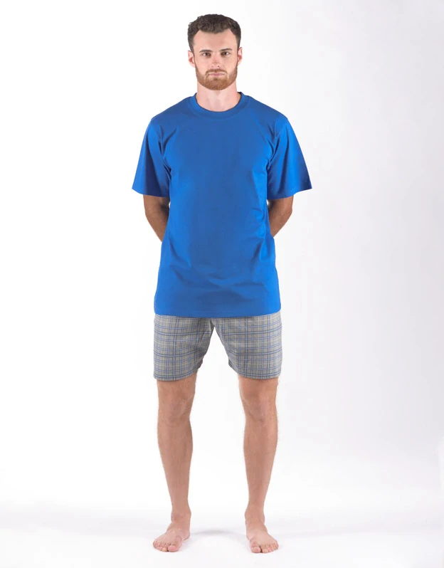 Pánske pyžamo voľného strihu z jemného úpletu Vám poskytne pohodlie počas spánku. Krátke nohavice s obľúbeným vzorom káro dopĺňa jednofarebné tričko s krátkymi rukávmi.
